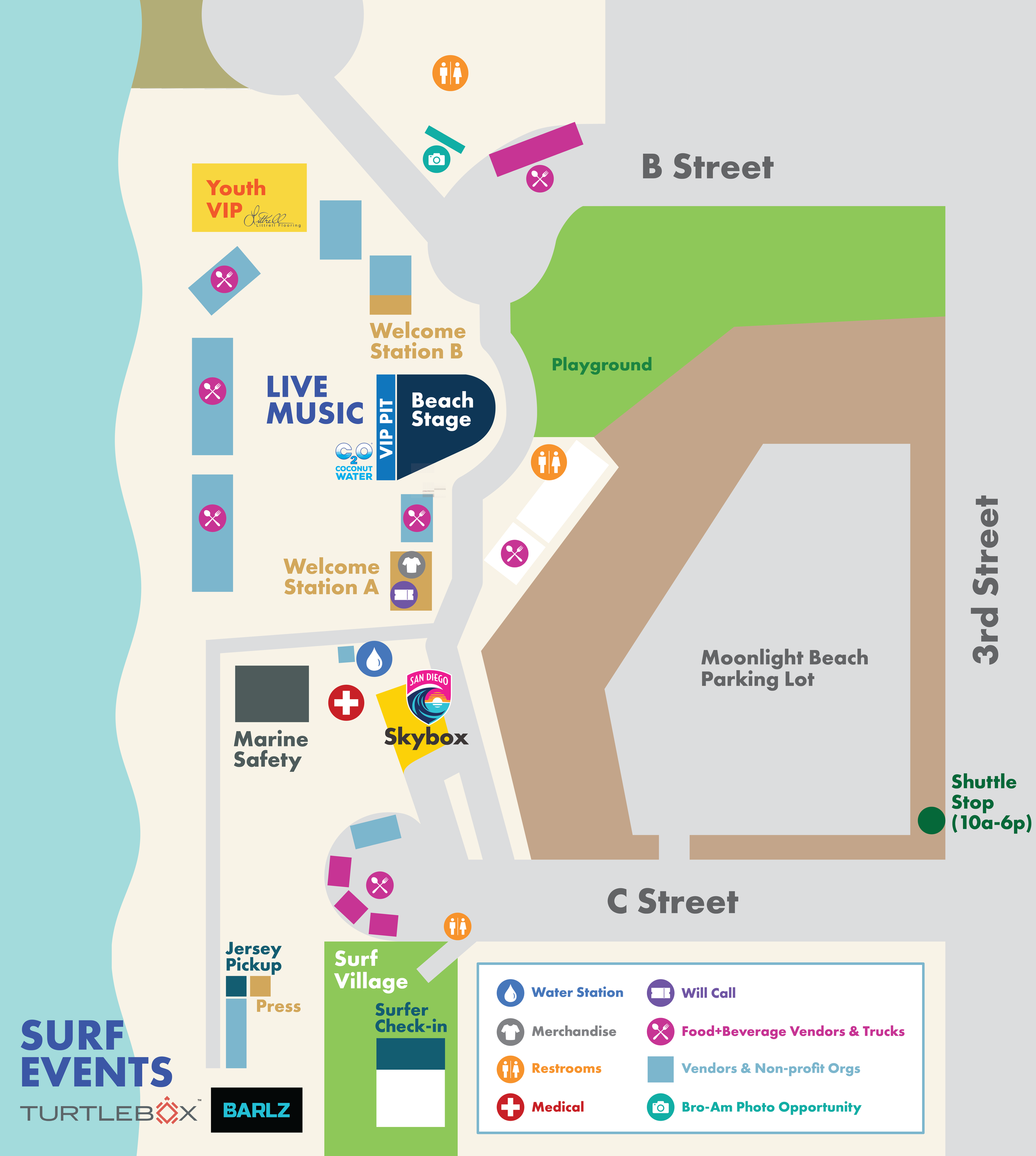 Surf's up! Watch top athletes shred the waves at Moonlight Beach. Surf Events sponsored by Turtlebox and Barlz. Be sure not to miss the crowd favorite contest - surf joust!